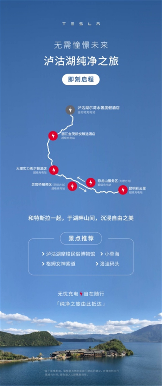 近日,这抹纯净的蓝迎来涤荡尘埃的现代科技,一条穿越如春昆明、胜境楚雄、明丽⼤理、妩媚丽江,直达澄净泸沽湖的特斯拉充电线路全线贯通。在这条纯净的能够涤荡凡尘心思的路线上,让淳朴的人们可以用更加纯净的出行方式来维护这一方神圣,也让来自五湖四海的特斯拉车主免除“充电焦虑”,不再憧憬未来,即刻便可轻装踏上寻梦之旅。