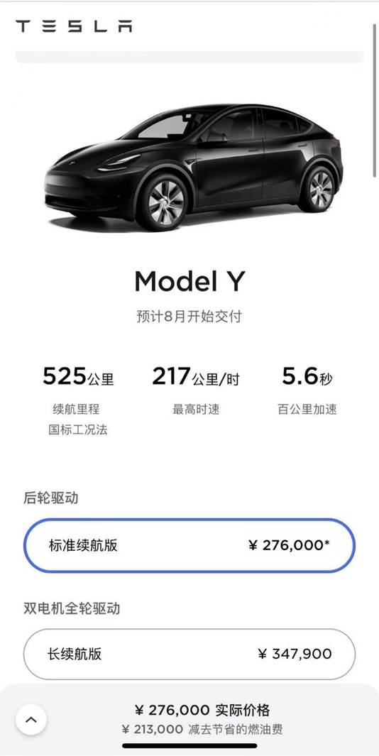 特斯拉Model Y标准续航版起售价为276,000元,续航里程(国标工况法)达到525公里。单电机后轮驱动的动力配置下,百公里加速仅需5.6秒,最高车速可达217公里/小时,标配高级内饰套件,以强大的产品力与极高的性价比得众多车主青睐。