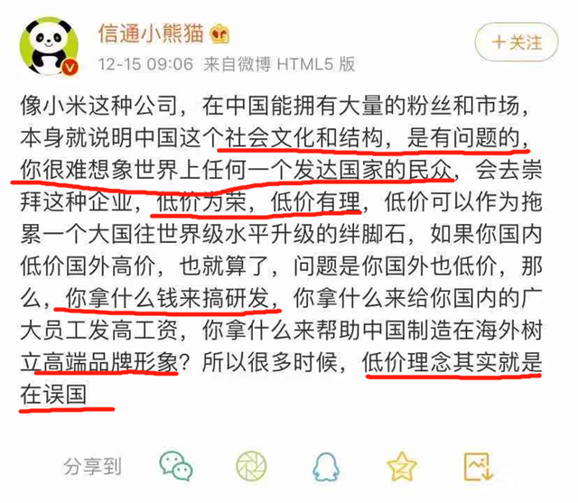 不知是眼红小米性价比时不时“搅乱”手机市场,还是对“便宜没好货”的说法深信不疑。12月15日有网友在微博上公开表示小米的低价售卖政策产生了严重后果,他提出低价不仅对研发毫无帮助,更无法树立品牌高端形象,严重处这位网友更用“低价理念其实就在误国”来进行言语“攻击”。