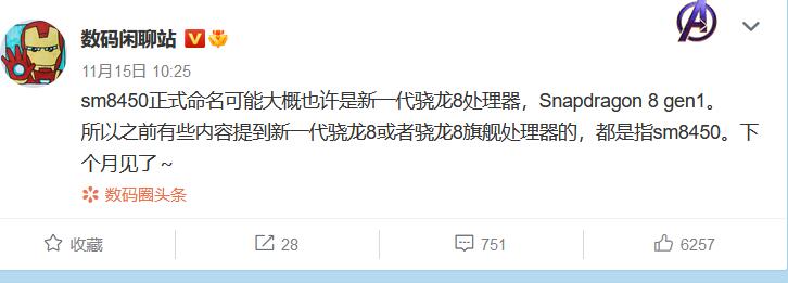 爆料称,全新的命名方式为「骁龙 8 gen1」,也就是说未来几年会出现gen 2、gen 3等命名方式。