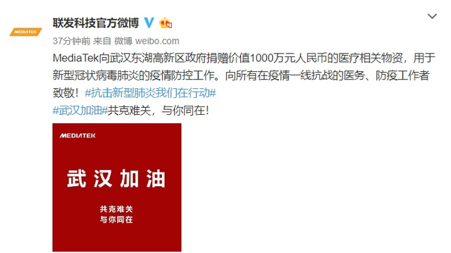 面对不少“联发科终于在捐款上干掉了友商”的言论中,个人觉得,在如此重大的疫情前,不管对于企业和还是个人,捐多少都是好样的。