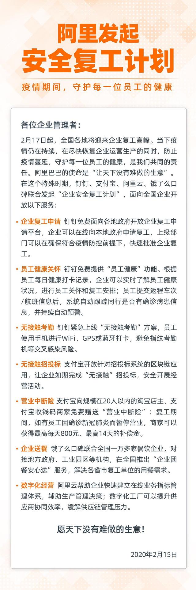 2月15日消息,阿里巴巴今日发布了全新的复工计划,以帮助全国企业能够在未来安全有序复工。发布的公告中提到这项计划包含企业复工申请、员工健康关怀、无接触考勤和企业送餐等7项服务。阿里将联合旗下钉钉、支付宝、饿了么和阿里云推行该计划。如果计划能够顺利实施,将能挽救不少仍身处“寒冬”的企业尽快步入复工正轨。(附公告图)