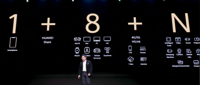 发布会一开始,对于网络疑问的“1+8+N”全场景智慧生活战略,余承东解释到,“1+8+N”其实就是手机+VR/AR、PC、可穿戴设备+ioT物联网等,+是华为用来连接他们的方式。