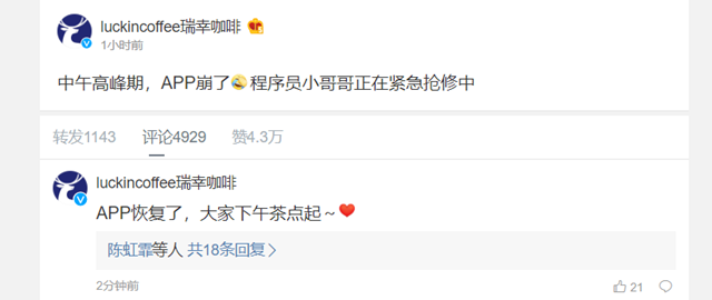不过,目前尚不得知瑞幸咖啡APP崩溃的确切原因。截至截稿前,瑞幸咖啡再次在其官方微博发布消息称APP已经恢复了正常使用。