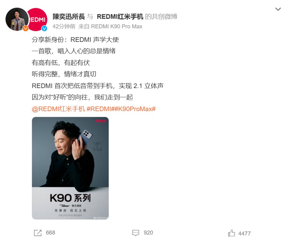 Redmi K90 Pro Max将发,陈奕迅任声学大使