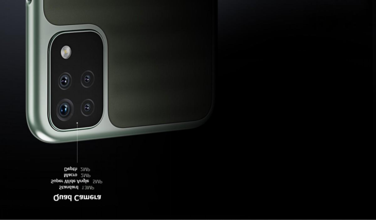 从手机正面照可以看出,这款手机采用了中间挖孔的全面屏设计,据悉,这块屏幕大小为6.6英寸,分辨率为HD+。背部四摄分别为1300 万像素的主相机,500 万像素的超广角镜头, 200 万像素的景深镜头和 200 万像素的微距镜头,相机配置还是很高的。