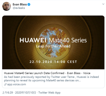 10月10日,今天早间的一则爆料消息称华为将会在中欧夏季时间10月22日的下午2点召开华为Mate40 系列发布会。也就是北京时间的晚上8点,本次发布会的主题是“Leap Further Ahead”(向前迈进)。