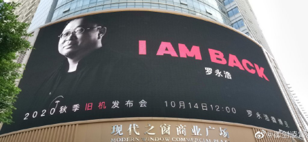 但是昨天,有网友在深圳的现代之窗商业广场发现了老罗的巨幅海报,老罗身穿熟悉的锤子科技logo的衣服,宣称“I AM BACK”,并将在10月14日12点举行2020 秋季旧机发布会。随后罗永浩也转发确认了此事,网友直呼“爷青回”。