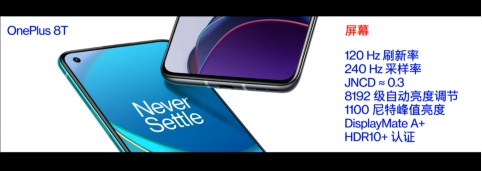 一加8T 使用的是一块三星显示提供的2.5D柔性屏幕,刷新率为120Hz,之所以用柔性屏去做直屏,是因为柔性屏更加轻薄,所以整机厚度仅有8.4mm,重量为188g。尽管成本上去了,但是一切为了体验。一加的屏幕素质从它花一亿去定制屏幕开始,就成了国产安卓手机屏幕显示的标杆,一加8T 的屏幕同样非常出色,拥有HDR 10+ 的显示效果,色差JNCD仅有0.3,支持8192级的自动亮度调节等等。