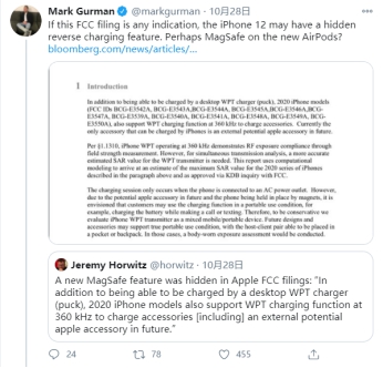 不过去年外媒iFixit 在拆解iPhone 11Pro时发现,内部有支持双边无线充电功能的部分配件,虽然不能完全实现反向充电,但是给iPhone 将支持反向充电提供了基础。近日FCC 的一份关于iPhone 12 的文件中显示,新iPhone 将会支持反向无线充电。
