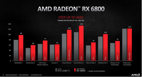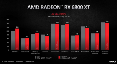 Radeon RX 6800包含60个单元和1815MHz的游戏频率;Radeon RX 6800 XT增加了堆栈数量,将单元数量增加到72颗,游戏频率提高到2GHz以上,并且主板总功率增加到300W;Radeon RX 6900 XT与Radeon RX 6800 XT拥有相同的规格,唯一不同的是,其单元数量从72个增加到了80个。AMD为每款GPU都配备了16GB的GDDR6 内存,用来提升用户在4K游戏上的体验。