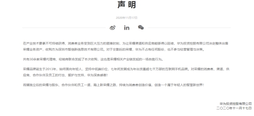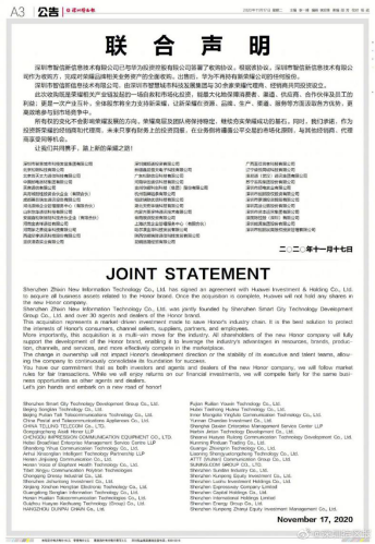 11月17日上午,一则重磅消息引爆了科技圈。多家企业在《深圳特区报》上发表联合声明,声明指出:深圳市智信新信息技术有限公司已与华为投资控股有限公司签署了收购协议,根据该协议,该公司完成对荣耀品牌相关业务资产的全面收购。并且出售后,华为将不再持有新荣耀公司的任何股份。