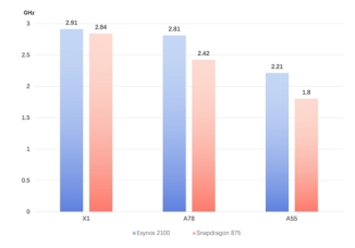 这颗Exynos 2100 芯片的超大核心主频性能可以达到2.91GHz,高于大核心A78的2.8GHz。对比高通骁龙875 的超大核心X1 的2.84GHz主频,同样是超大核心反而主频出现了比较大的波动。智八斗认为这可能是因为ARM的超大核心X1 支持定制,根据客户的不同应用场景调整X1内的模块设计,因此三星和高通在相同核心下的主频会出现不同结果。