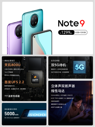 另外还有Note9 5G,搭载的是天玑800U,6.53英寸的左上角挖孔屏,4800万三摄组合,5000毫安时的大电池,同样支持线性马达。售价6+128GB 1299元,8+128GB 1499元,8+256GB 1699元。