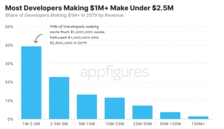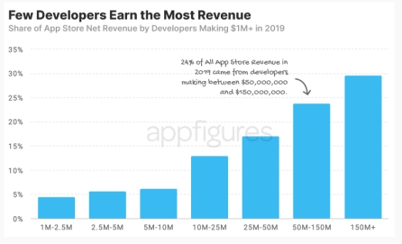 或许是苹果方面有些忌惮了,将这项抽取30% 佣金的规定下调为抽取15%。然而这项规定仅仅只对那些年收入在100万美元以下的开发者有效,这就意味着Epic被排除在外。一项来自国外专业数据媒体appfigures的调查显示,这项规则更改后,将会使98%的开发者受益。