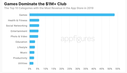 有趣的是,这些使开发者年收入超过100万美元的应用中,游戏应用占据了50%以上。随后是健康,社交软件,娱乐,照片视频等等,这些领域之间相差不大,反而与游戏行业差了40%多的距离。这也不难推测,用户在游戏中需要购买大量道具获得体验,而其他应用至多订阅会员就可以在一个月甚至一年里获得服务。可见游戏行业真是一个暴利的行业。