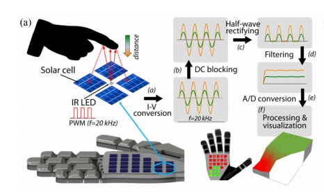 该设备的工作原理是,当其暴露在光源下时,太阳能电池板就开始工作产生能量。而众所周知太阳能电池对于光照强度非常敏感,所以如果一个单元上的电池被物体遮挡,则收集到的能量就会减少,如果直接触摸到这块区域,则完全无法收集能量。通过这种感应光照强度的方式,甚至可以进行距离测量,而该团队也加入了红外线来辅助校准。
