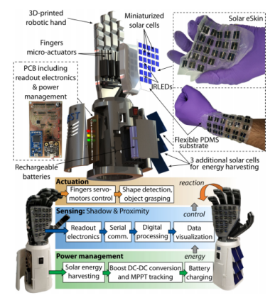目前为了实现机械设备的触觉反馈,一般都是用的压感使电流发生变化进而测量。而现在,格拉斯哥大学的研究人员们开发出了利用微型太阳能电池制成的,无需专用触摸传感器的“电子皮肤”,由于使用的是太阳能,它甚至还可以产生能量。
