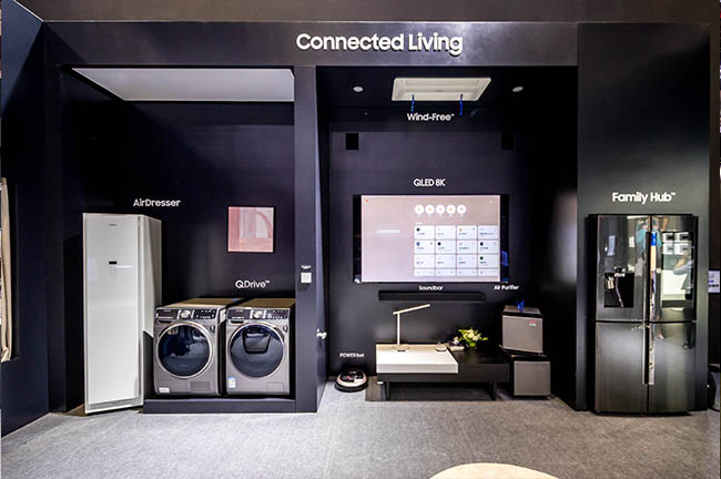 在“三星智家”展区,三星打造了一个开放式的物联网生态平台,安防、通讯、室内灯光、家电、背景音乐以及环境监测等都能实现智能控制,系统展现了家庭物联网(IoT)解决方案。